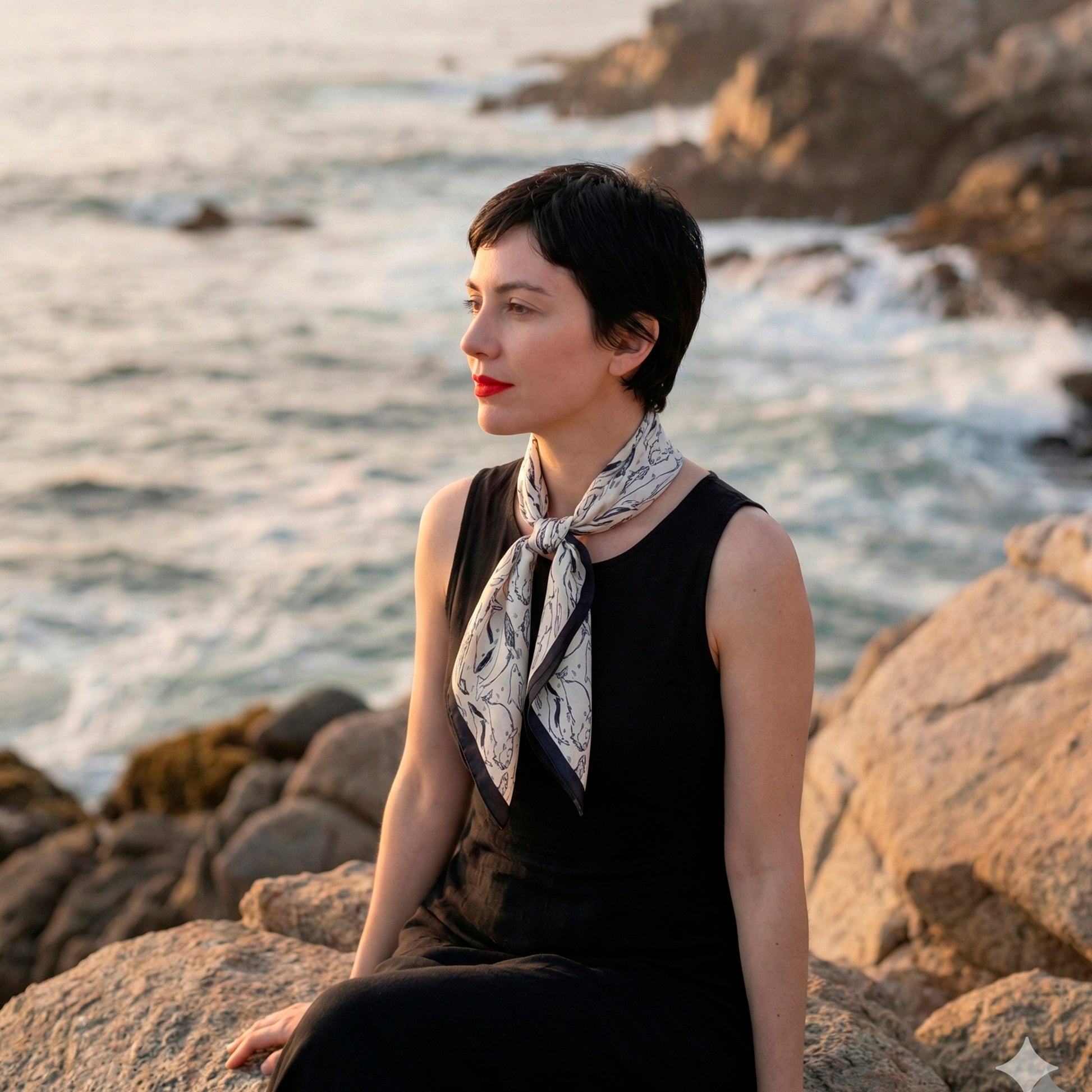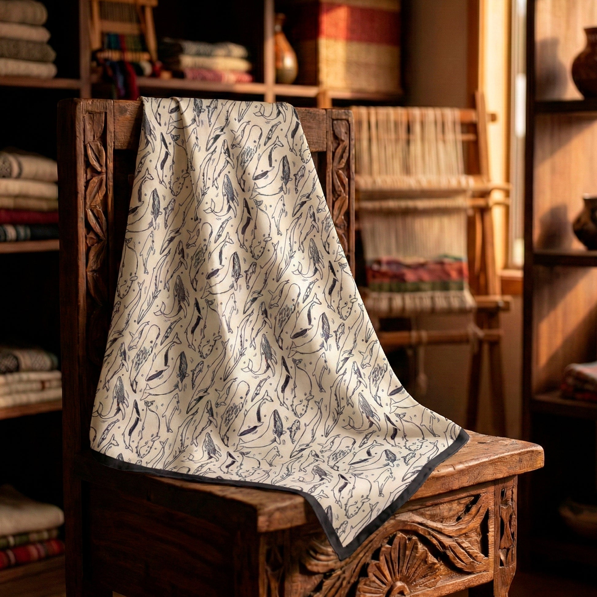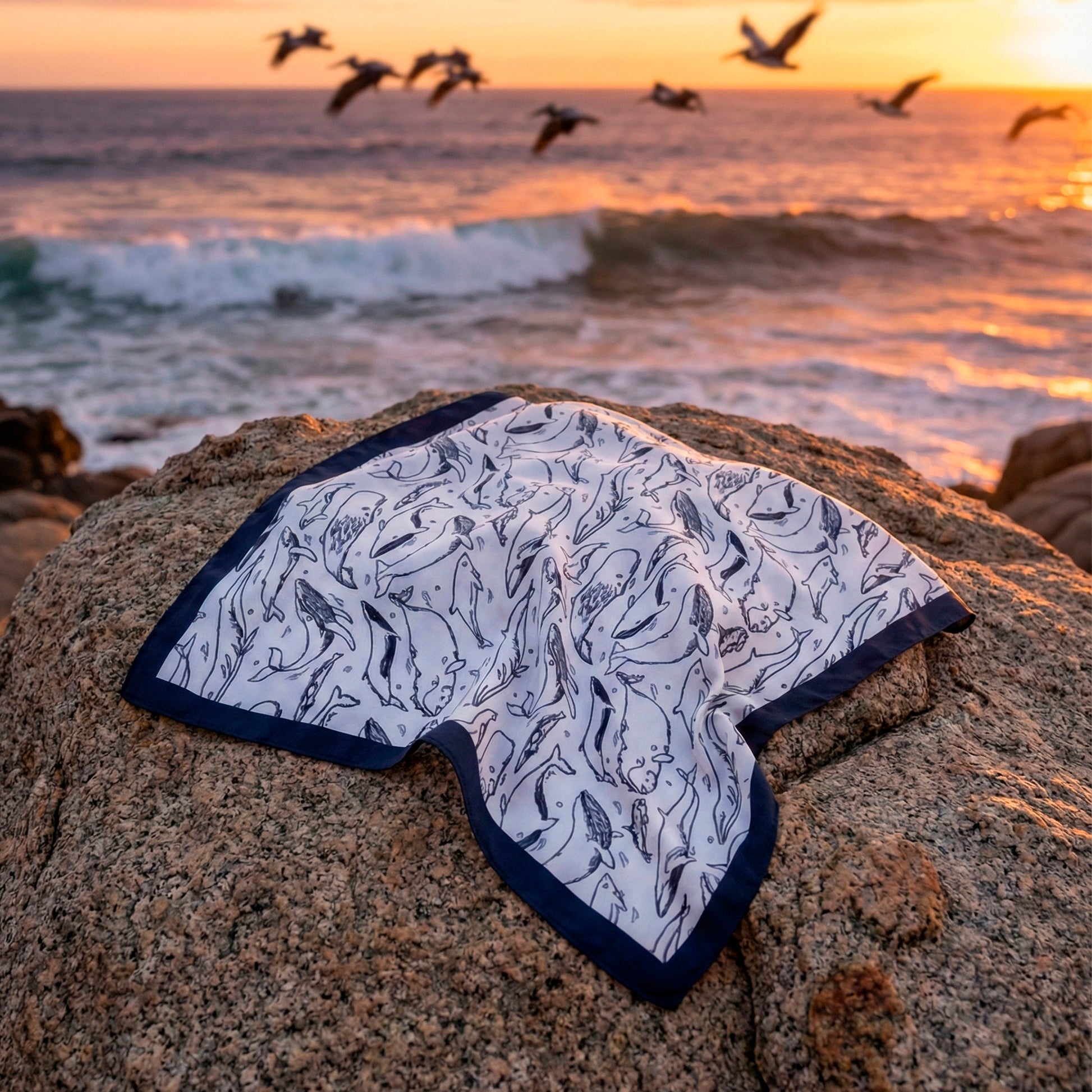 Pañuelo ilustrado con ballenas que habitan nuestras costas chilenas: Ballena Franca Austral, Ballena Fin, Ballena Sei, Ballena Azul y Ballena Jorobada.