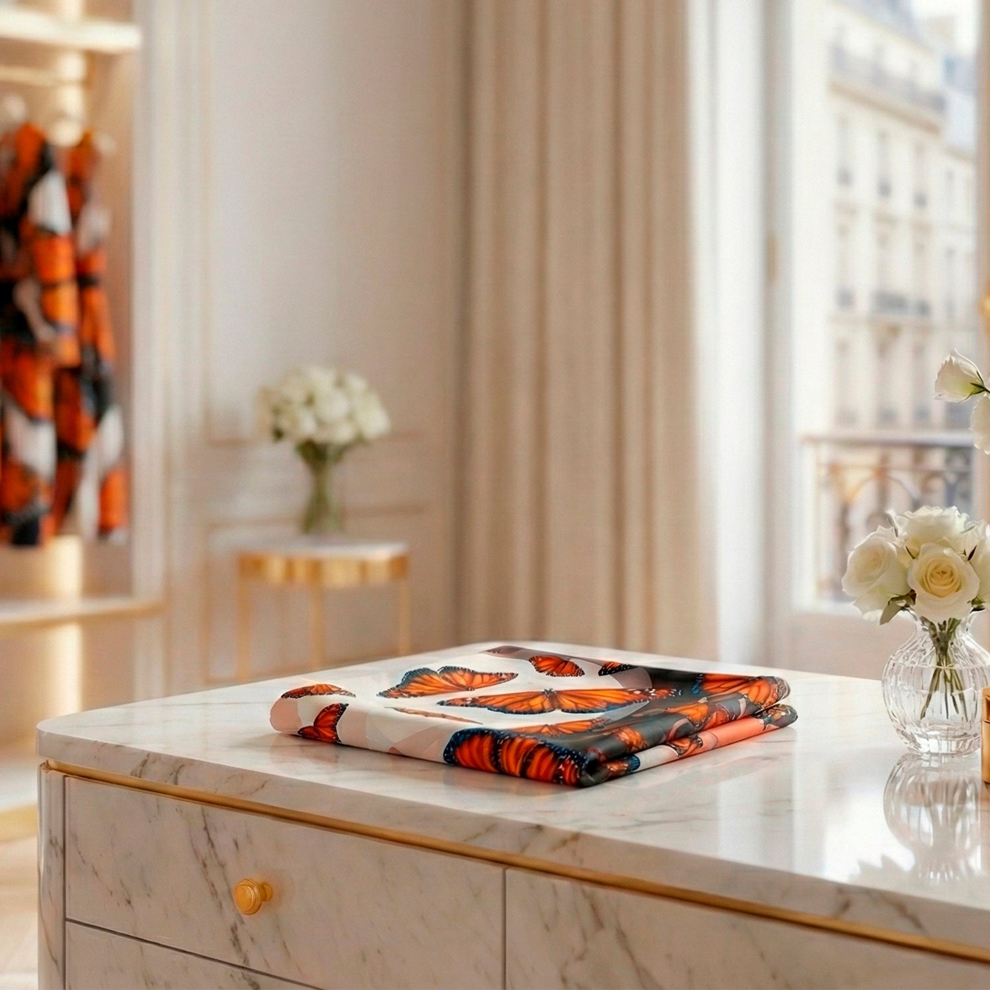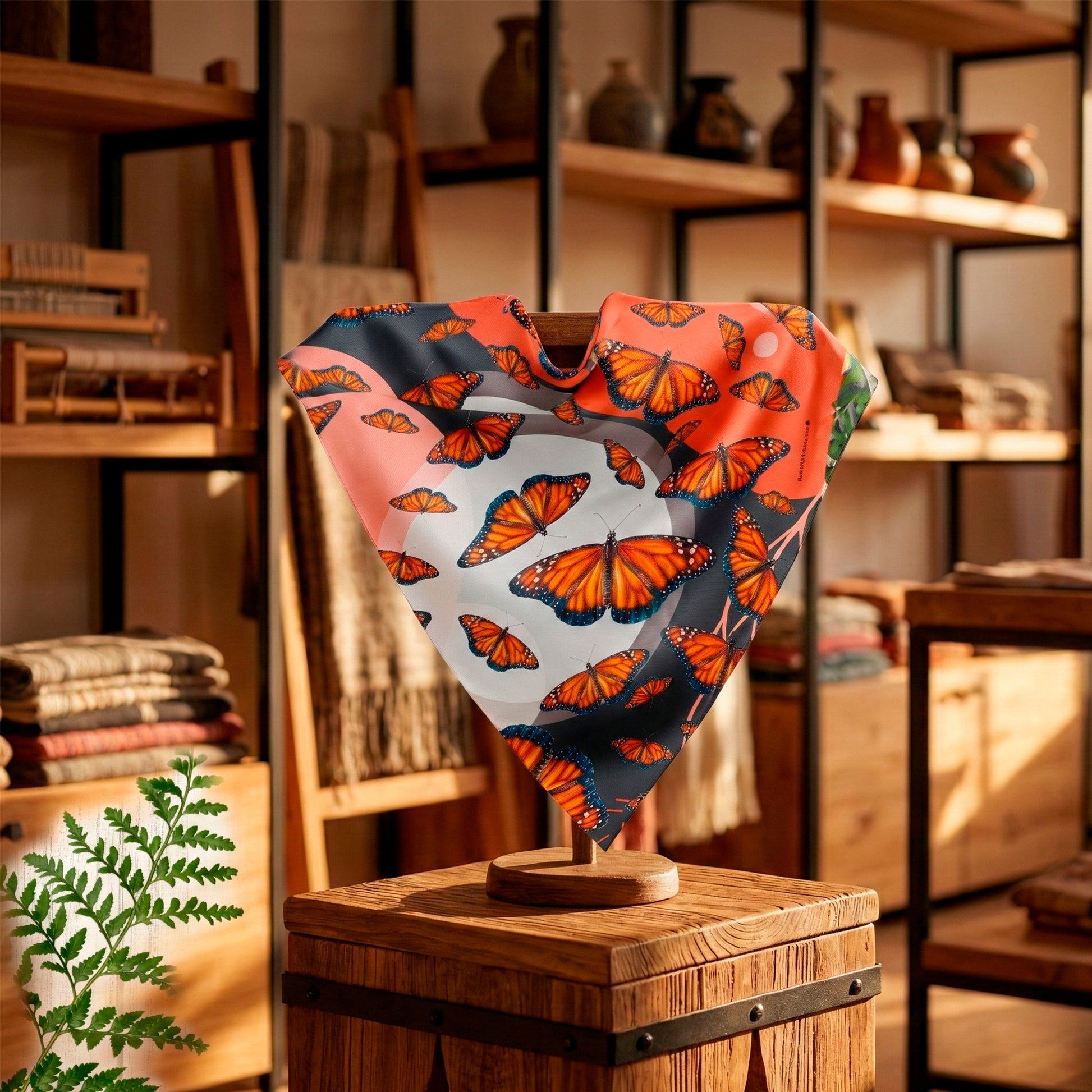 Amamos este pañuelo ilustrado con una de las especies más lindas que habitan Chile: la Mariposa Monarca Austral. Mide 70 x 70 cms. y está realizado en tela hecha con 60% de botellas plásticas recicladas.
