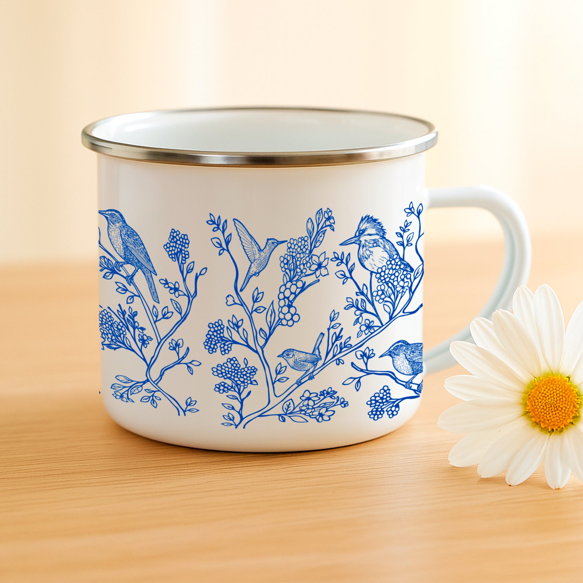 Tazón de acero enlozado de 283cc., hermosamente ilustrado y que posee un borde de acero inoxidable para mayor protección de tu boca. Nos inspiramos en la cerámica antigua Willow o su versión chilena de la marca Lozapenco para ilustrar nuestra colección de cosas que atesorarás, tal como esos platos y cerámicas de antaño, los de la abuelita.